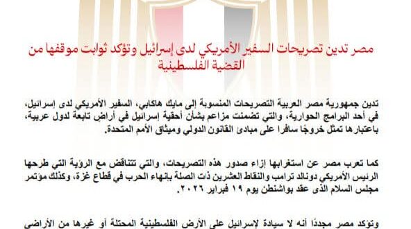 مصر تدين تصريحات السفير الأمريكي لدى إسرائيل وتؤكد ثوابت موقفها من القضية الفلسطينية