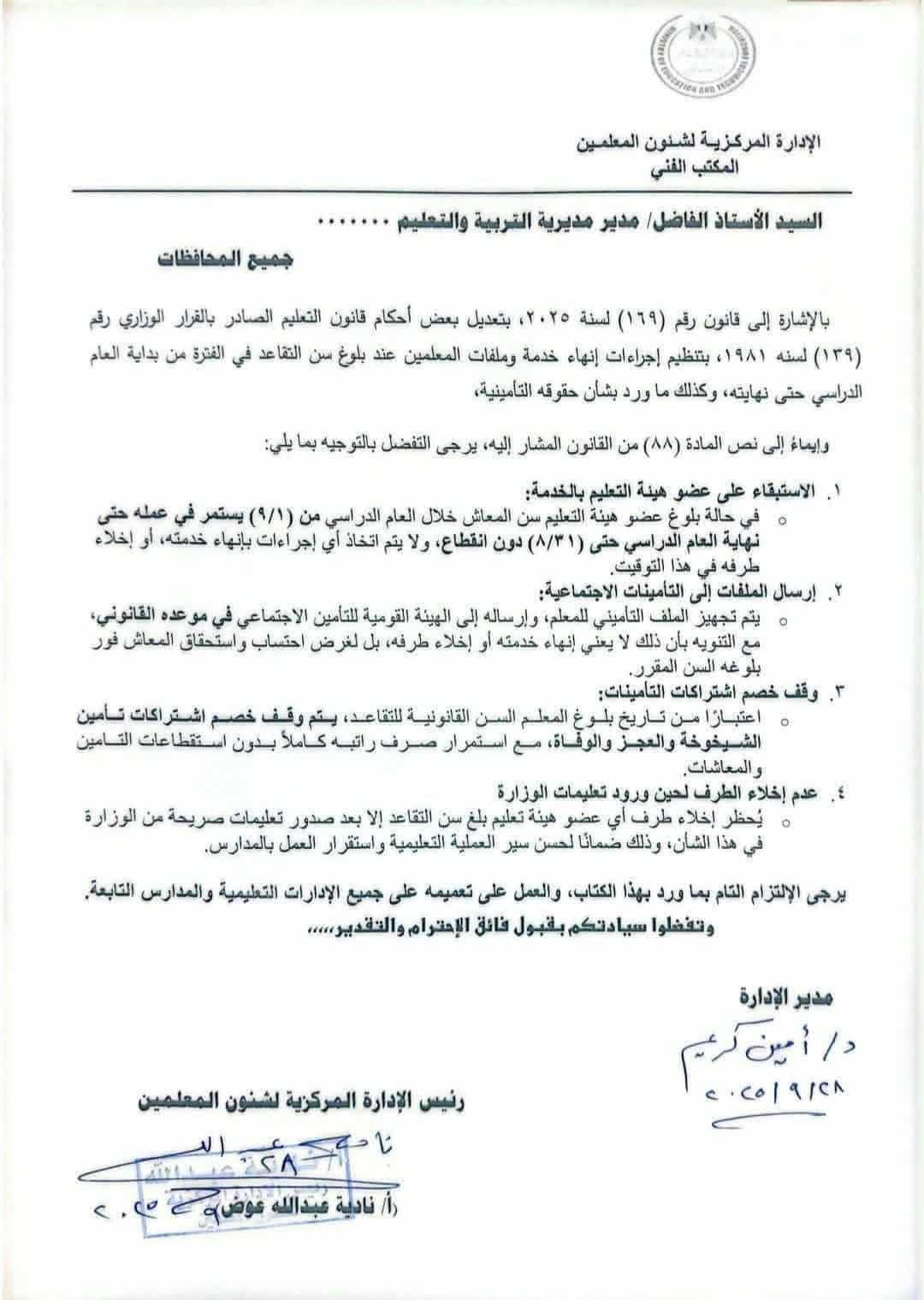 وشددت الإدارة المركزية على أنه لا يجوز إخلاء طرف المعلمين الذين بلغوا سن التقاعد إلا بعد صدور تعليمات صريحة من وزارة التربية والتعليم، وذلك حرصًا على ضمان حسن سير العملية التعليمية واستقرار العمل داخل المدارس.