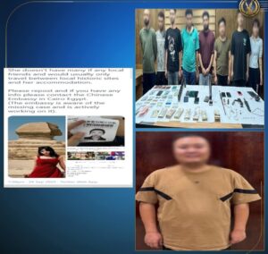 بالنسبة لما تم تداوله بعدد من الحسابات على مواقع التواصل الإجتماعى بشأن إختفاء سائحة صينية داخل البلاد بالفحص تبين أن المذكورة تم ضبطها وآخرين وفقاً لإجراءات مقننة ضمن تشكيل عصابى للإحتيال الإلكترونى يضم (8 عناصر من ضمنهم 3 يحملون جنسية دولتها ) تخصص نشاطهم الإجرامى بإستدراج ضحاياهم ” معظمهم من أبناء دولتها ” بدعوى العمل بالبلاد بالتجارة الإلكترونية وإختطافهم عقب وصولهم وإرغامهم على التواصل مع أهليتهم لسداد مبالغ مالية كفدية يتم إرسالها من خلال المنصات الإلكترونية ، وقد تم إستهدافهم وضبطهم بإحدى الشقق السكنية بدائرة قسم شرطة التجمع الأول وبحوزتهم (أسلحة نارية وبيضاء وصواعق كهربائية – هواتف محمولة تحوى دلائل نشاطهم الإجرامى) .. كما أمكن تحرير أحد المختطفين من حاملى جنسية الدولة المشار إليها كان بصحبتهم .