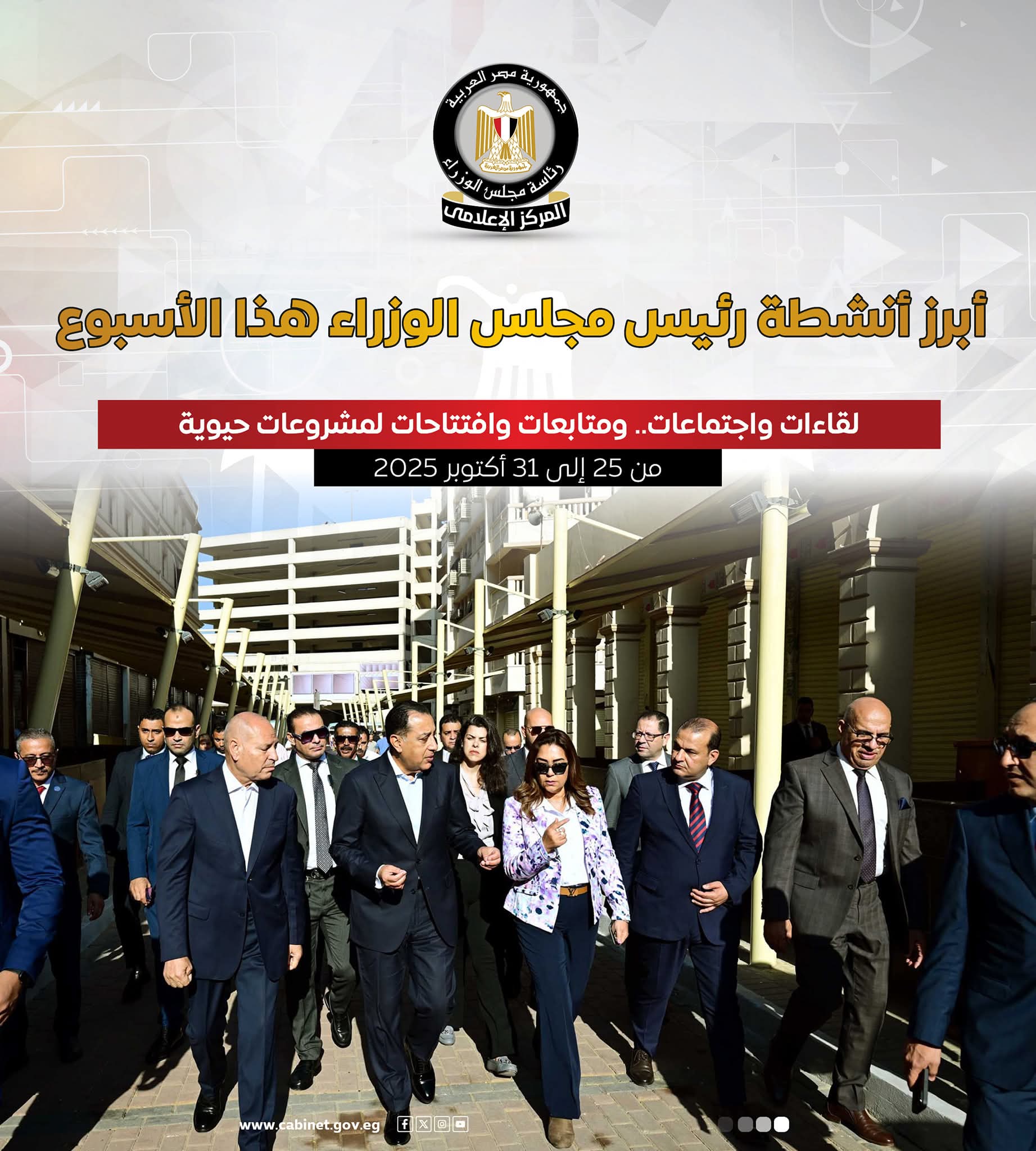 المركز الإعلامي لمجلس الوزراء يستعرض بالإنفوجراف أبرز أنشطة رئيس مجلس الوزراء هذا الأسبوع