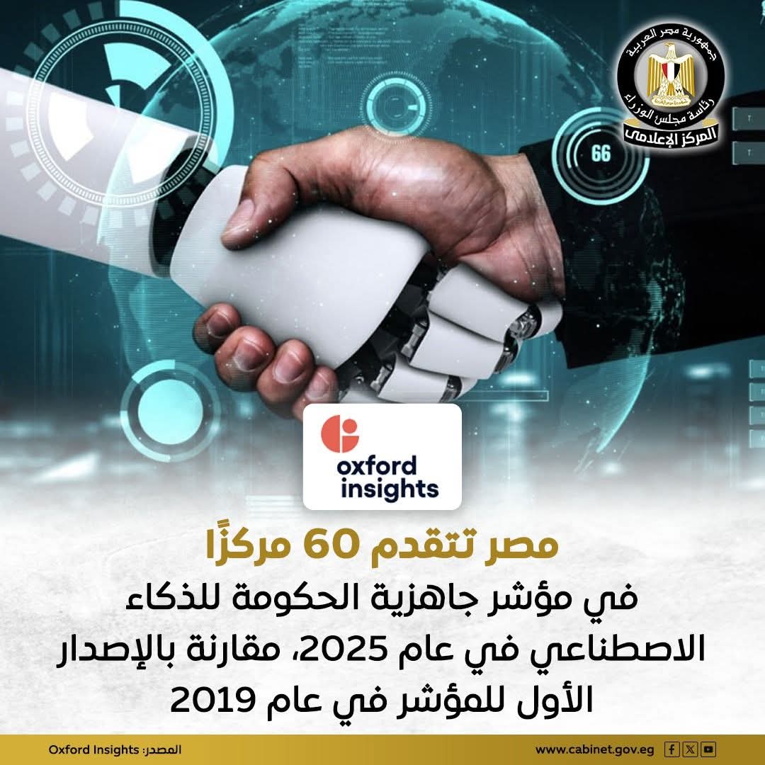 مصر تصل إلى المركز 51 عالميًا في مؤشر جاهزية الحكومة للذكاء الاصطناعي في عام 2025، مقارنة بالمركز 111 في عام 2019، لتقفز 60 مركزًا، كما احتلت المركز الأول عالميًا في المحور الخاص بقدرة السياسات بمقدار 100 نقطة، إلى جانب أستراليا وصربيا وبريطانيا، علمًا بأن المؤشر يعبر عن مدى استعداد الحكومات لتطبيق الذكاء الاصطناعي في تقديم الخدمات العامة.