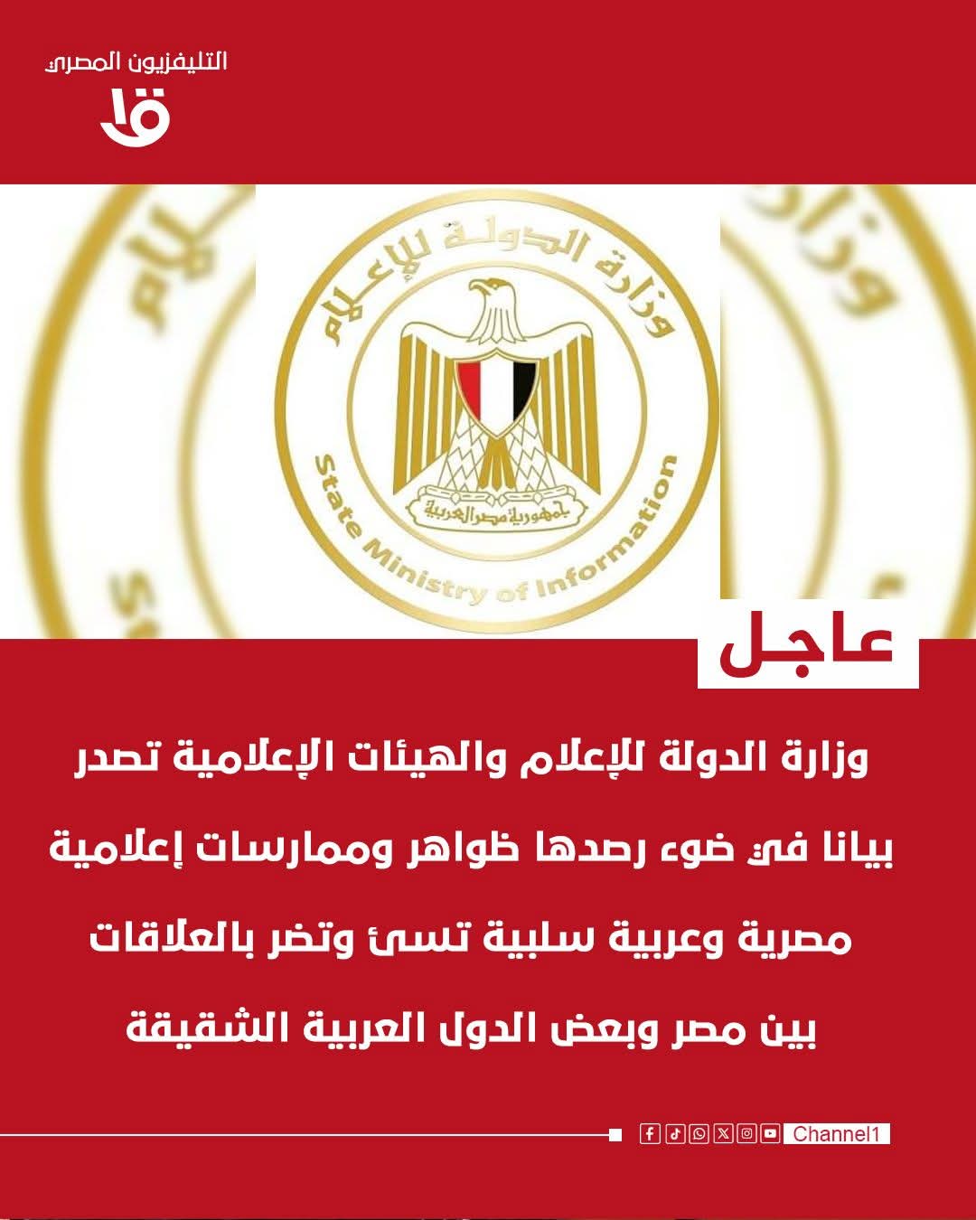 وزارة الدولة للإعلام والهيئات الإعلامية تناشد كافة الإعلاميين التوقف الفوري عن الممارسات التي تضر بالروابط الأخوية بين مصر والدول العربية