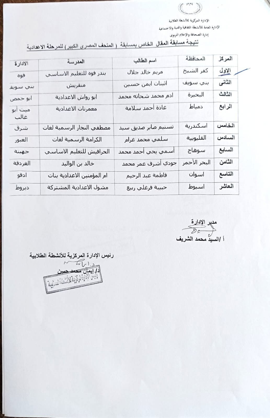 قدم معالي وكيل الوزارة الدكتور علاء جودة وكيل وزارة التربية والتعليم بكفرالشيخ التهنئة لتوجيه عام الصحافة والإعلام التربوي بقيادة الدكتورة/داليا عليبة وذلك لفوز الطالبة المبدعة/مريم خالد جلال مدرسة بندر فوة للتعليم الأساسي التابعة لإدارة فوة التعليمية بالمركز الأول على مستوى الجمهورية في مسابقة المقال الخاصة بالمتحف المصري الكبير للمرحلة الإعدادية وأشاد سيادته بالجهود المبذولة من التوجيه والتي أثمرت العديد من المراكز على مستوى الجمهورية كما قدم سيادته الشكر والتقدير للقائمين على هذا الإنجاز متمنيا للجميع مزيد من التوفيق والسداد والتفوق دائما