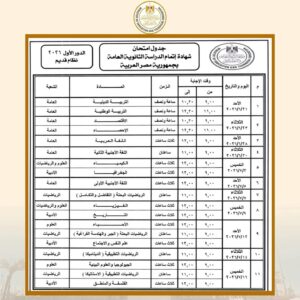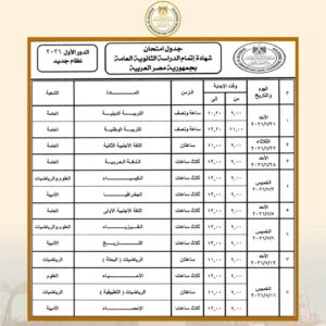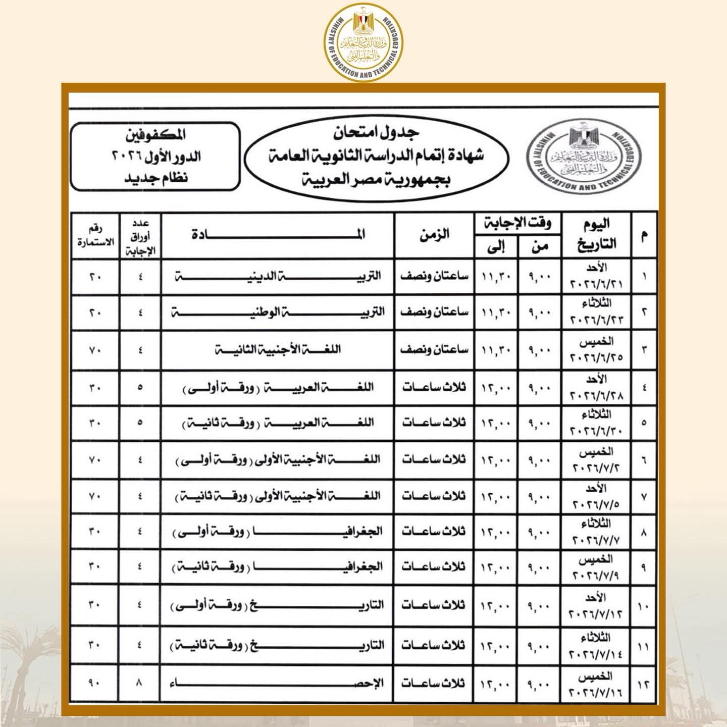 وبحسب جداول امتحانات الثانوية العامة، تبدأ امتحانات الثانوية العامة للدور الأول (نظام جديد – نظام قديم) والمكفوفين يوم الأحد الموافق 21 يونيو 2026، وتستمر حتى يوم الخميس 16 يوليو 2026.