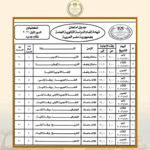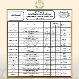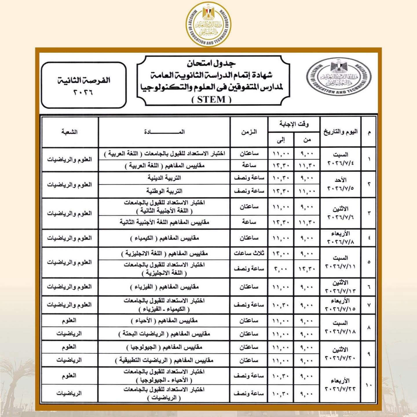 كما تبدأ امتحانات شهادة إتمام الثانوية العامة بمدارس المتفوقين في العلوم والتكنولوجيا “STEM” (الفرصة الأولى) يوم 16 مايو 2026 وتنتهي يوم 20 يونيو 2026، وتبدأ امتحانات (الفرصة الثانية) يوم السبت 4 يوليو 2026 وتنتهي يوم 22 يوليو 2026.