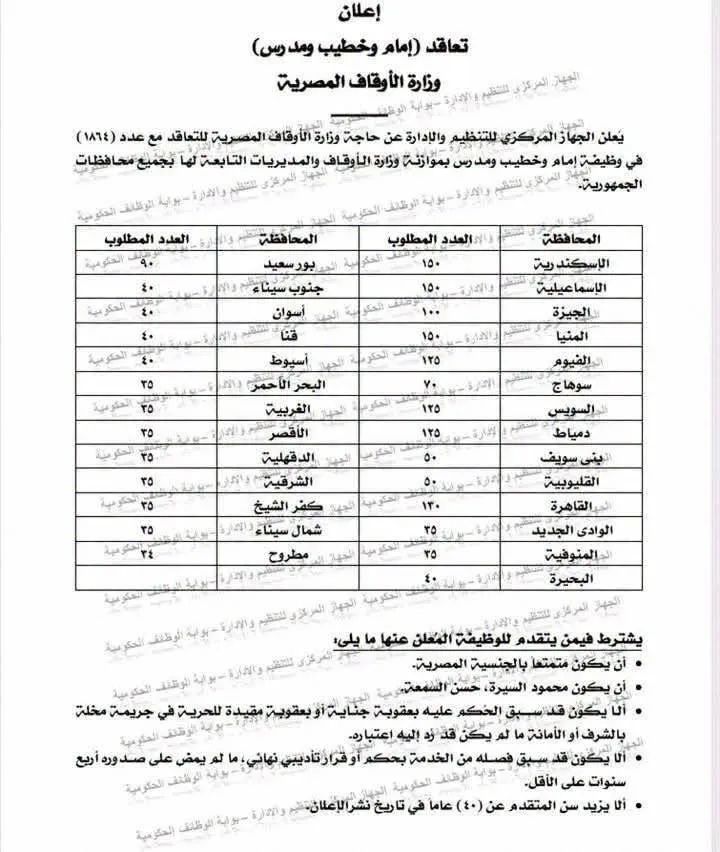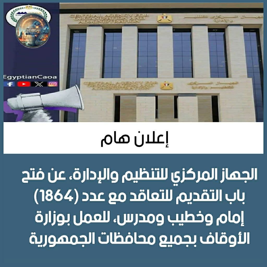 أعلن الجهاز المركزي للتنظيم والإدارة، برئاسة المهندس حاتم نبيل، عن فتح باب التقديم للتعاقد مع عدد (1864) إمام وخطيب ومدرس، للعمل بوزارة الأوقاف بجميع محافظات الجمهورية.